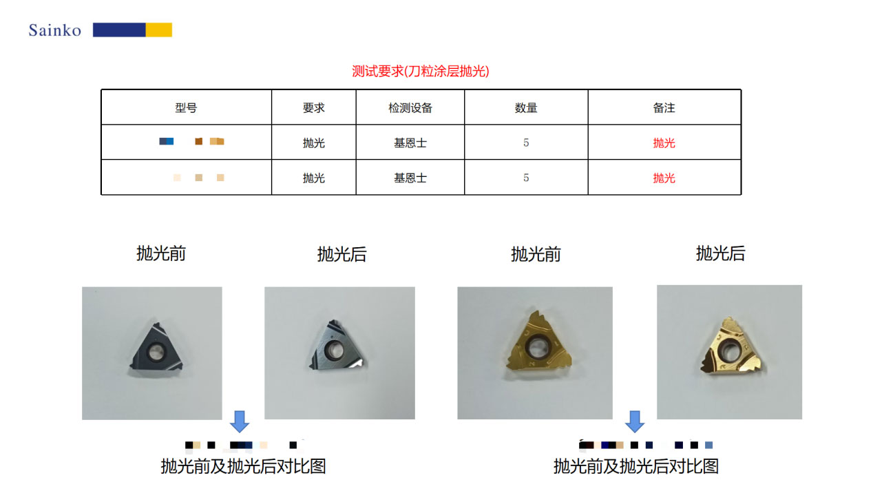本次测试样品为客户提供的两款刀粒,各5件,核心需求为涂层抛光处理。我司采用PL-12C设备及15000-L型号磨料进行加工,实现了涂层表面液滴去除,有效提升了产品表面质量。具体测试结果详见本报告。